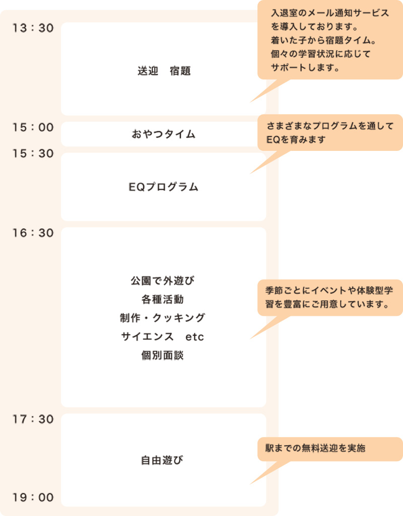- 1日の過ごし方はどんな感じですか? EQプログラムを40分程度実施し、宿題や外遊びを行います。
